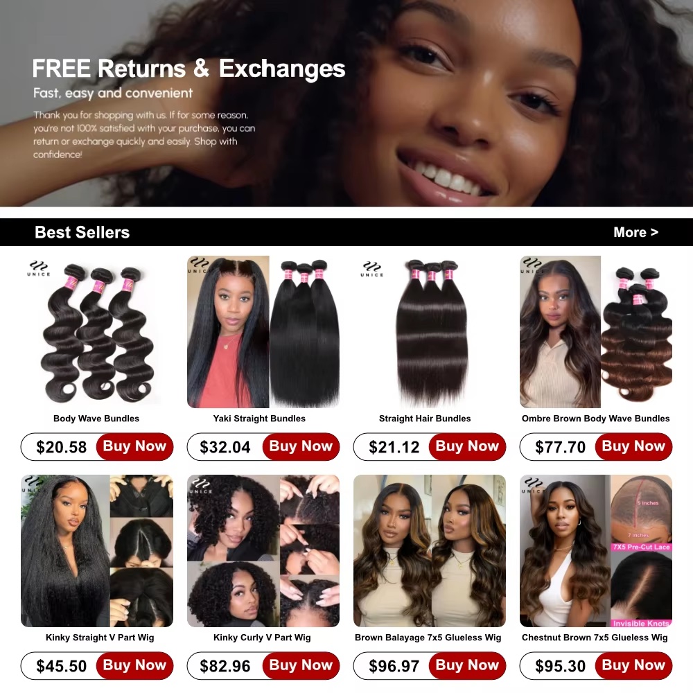 AliExpress Unice Hair Store (No.1081378), was built in 1999 at Xuchang Henan. Its official store on AliExpress launched on 2013 December.