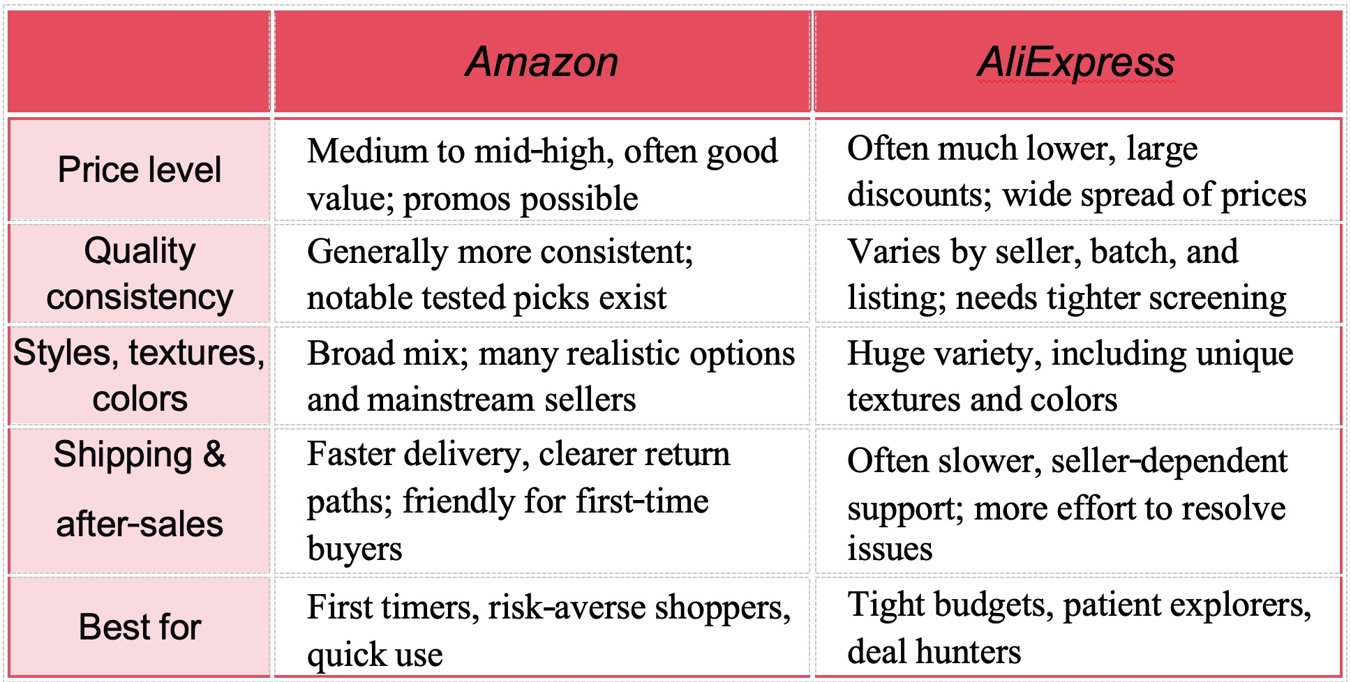 If you’re new, want to minimize risk, or need something for a specific date, Amazon is the safer first stop. If your budget is very tight or you want to explore unique textures and you’re willing to screen sellers carefully, AliExpress can be worth trying—just expect to work a bit harder.