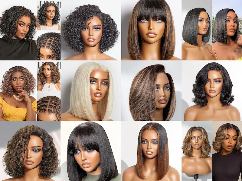 Representative Style: Stylish Bob Wigs made of 100% human hair and in various types and styles, such as Yaki Straight Bob Wig with Bangs, Natural Color Straight Bleached Knots Side Part Black Wig, Short Grey Layered Pixie Cut Wig, Ombre Blonde Highlight Silky Straight Glueless Pre Cut Lace Bob Wig, Undetectable HD Lace Curly Bob Wig with Blonde Highlights